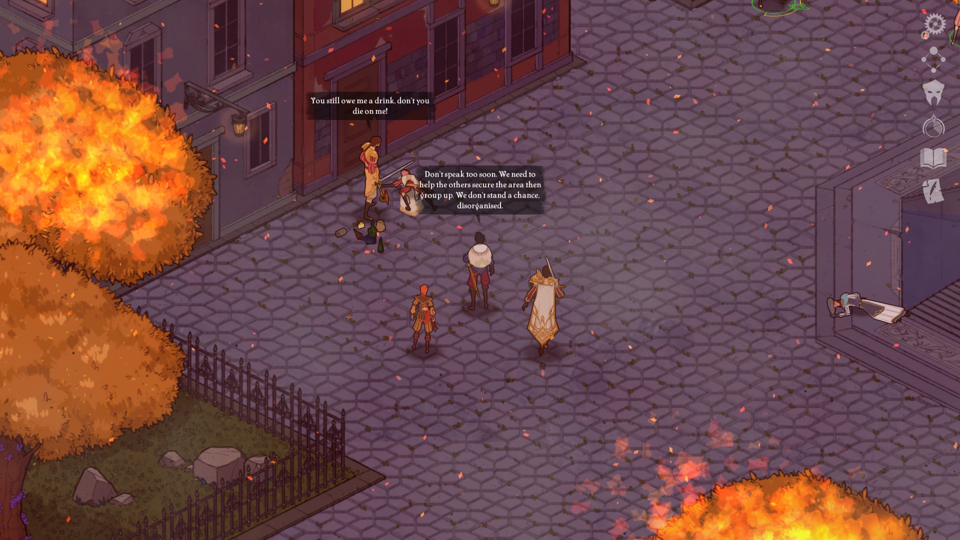 The other main aspect of this game is the combat. As I mentioned before, battles only take place at pre-determined points in the story. However, given that the game occurs during a war and there is the ever-present danger of the Fey, there is still plenty of call for combat throughout the story. Combat is somewhat similar to that of Baldur’s gate, with battles organically springing up and taking place on the regular environment. You can choose to control Cicero or any of your party members, position yourself to auto-attack or flank, utilize unlockable skills, and so on. One of the main defining features of Masquerada‘s combat is the tactical pause. As the name implies, this allows you to pause combat in order to gather your wits, scan the battlefield, and micromanage your team. Quite useful to get your squad back on track, since the party AI can be a bit fickle. The other unique feature is the elemental tag system, in which certain attacks can place a “tag” of their element on the target, and other attacks can activate that tag. Special effects are then triggered based on the combination of elements used. Full disclosure though: I didn’t really use the tags all that much, at least not intentionally. You can get by just fine without.